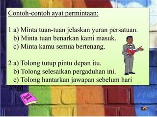 Saya memakai cermin mata. Ayat ini juga dikenali sebagai ayat Selapis. Ayat larangan ialah ayat yang menggunakan kata larangan seperti janganusah atau tak usah sebelum kata kerja dengan tujuan menegah seseorang melakukan sesuatu.